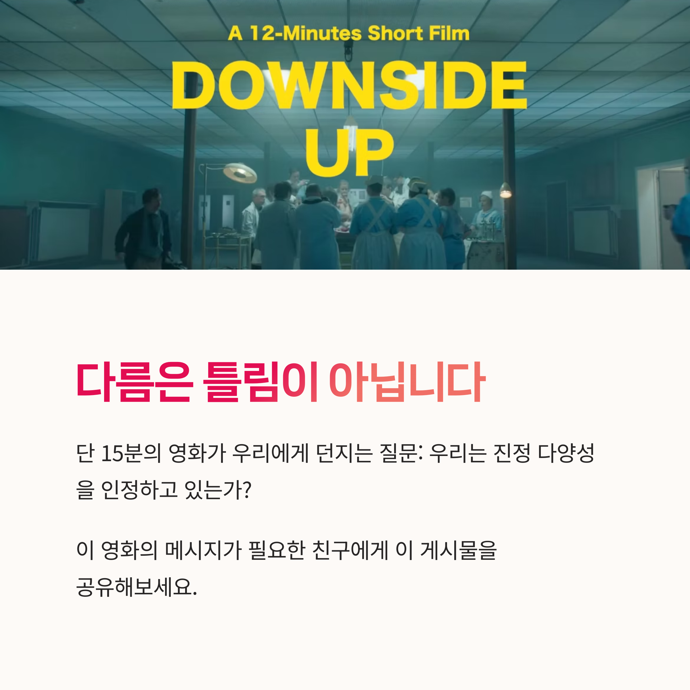 단편영화 뒤집힌 세계는 단지 독특한 설정만이 닌, 우리 사회의 시선을 되묻는 감동적인 이야기입니다. 다운증후군, 장애, 다름, 편견… 이 모든 키워드를 껴안은 작품으로, 짧지만 강한 메시지를 전달합니다. 지금 바로 영화를 통해 당신의 시선을 바꿔보세요.